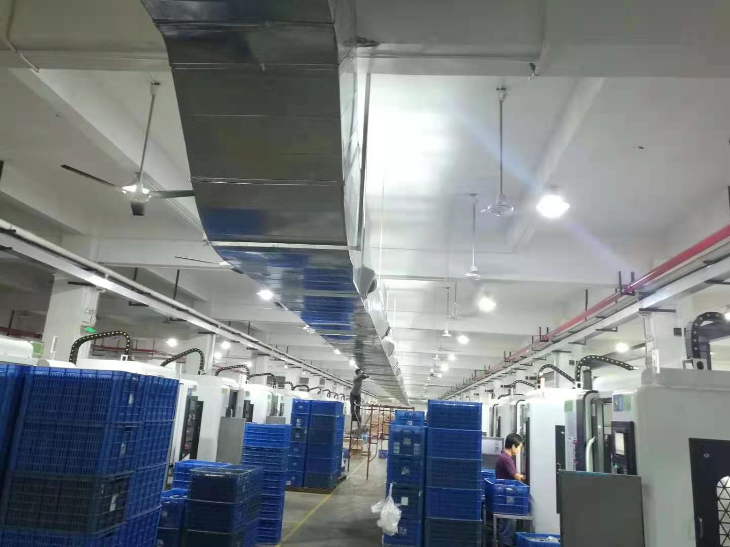 一般模具車間中的機械設備分布比較緊密,而像CNC設備、鉆床、磨床、銑床等機械設備在工作當中都會發熱,持續的工作發熱會使得車間內的溫度不斷的升高,伴隨著發熱的是設備生產過程中自帶的粉塵和異味。有些設備甚至會產生一些油霧。CNC工廠車間設備機器較多,整體發熱量較大,使車間內的溫度迅速上升,室內的空氣不流通,車間最高溫度可達到42度左右,如果不采用各種降溫設備降溫,員工基本上沒辦法工作。